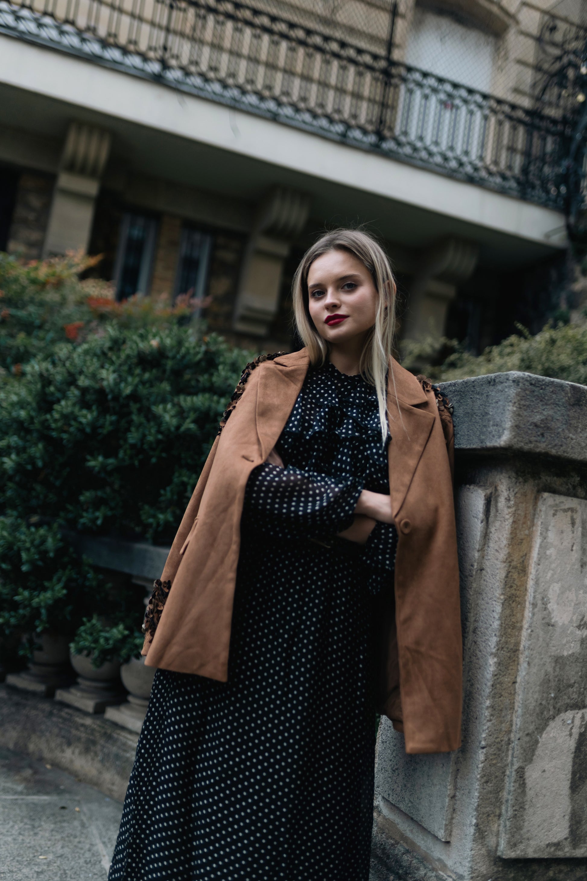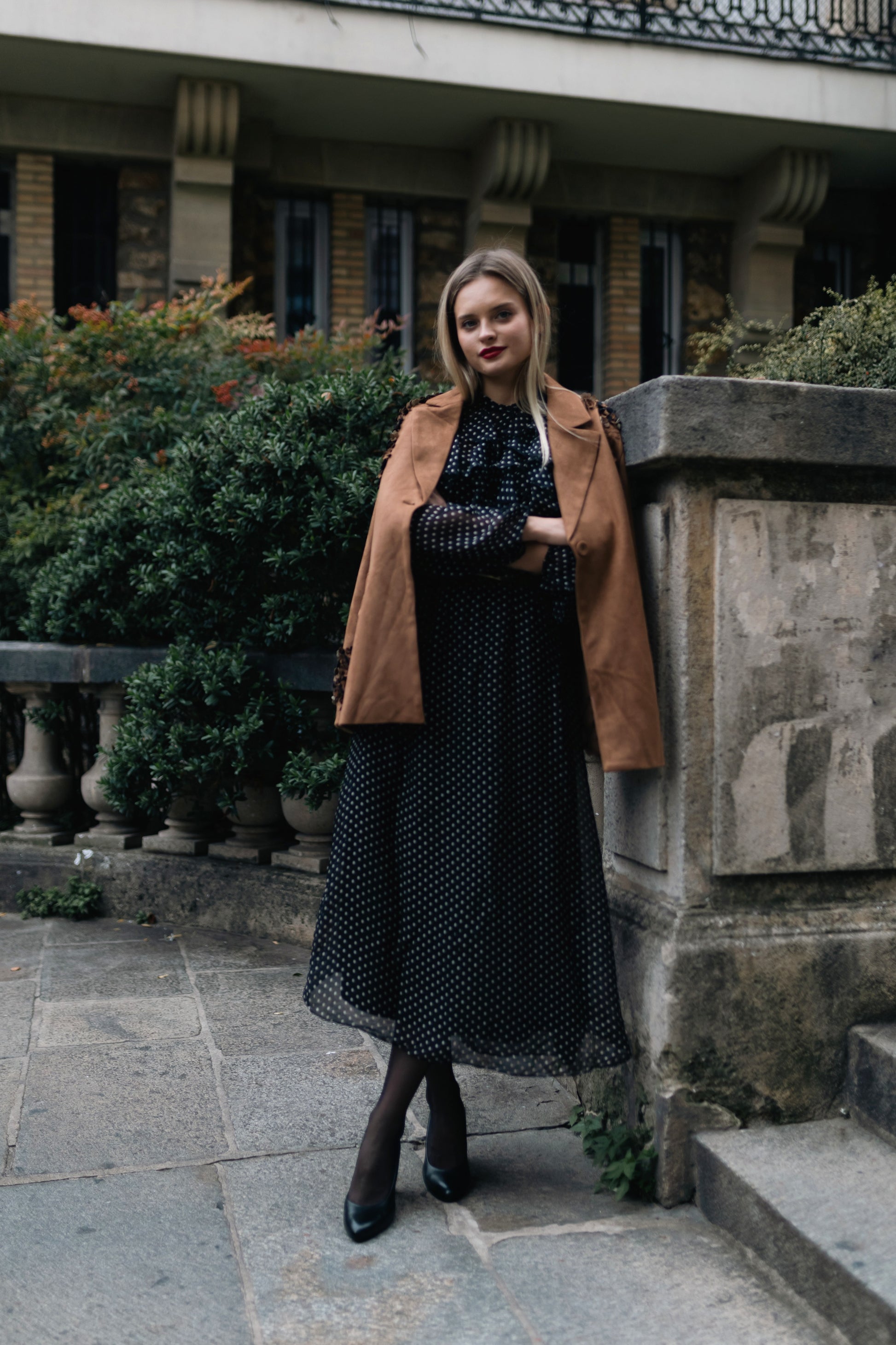 A poetic expression of timeless elegance, the Midnight Whisper dress captures the quiet allure of vintage femininity. Its delicate polka-dot chiffon dances lightly with each movement, while the sheer long sleeves and romantic ruffled front add graceful volume and texture. The belted waist refines the silhouette, sculpting a balanced harmony between fluidity and structure.